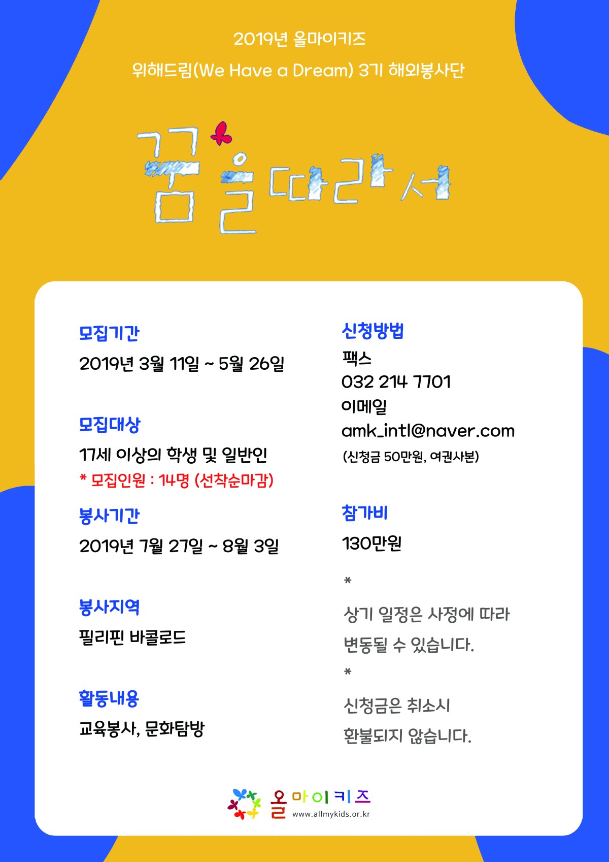 2019년 올마이키즈 위해드림(We Have a Dream) 3기 해외봉사단을 모집합니다.